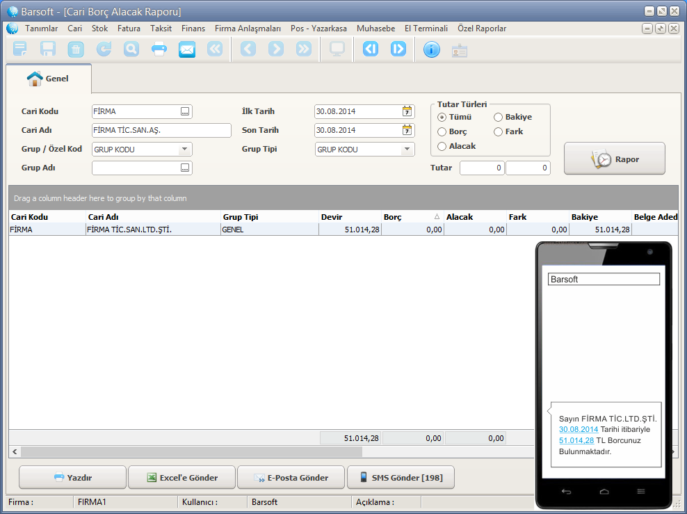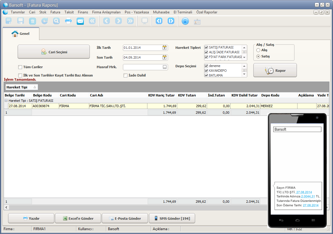 - Fatura raporu üzerinden de SMS gönderilebilir. Burada da yine dizayn yapılabilir.